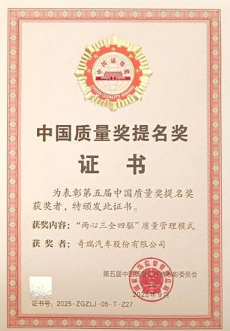 奇瑞获得“中国质量奖提名奖”