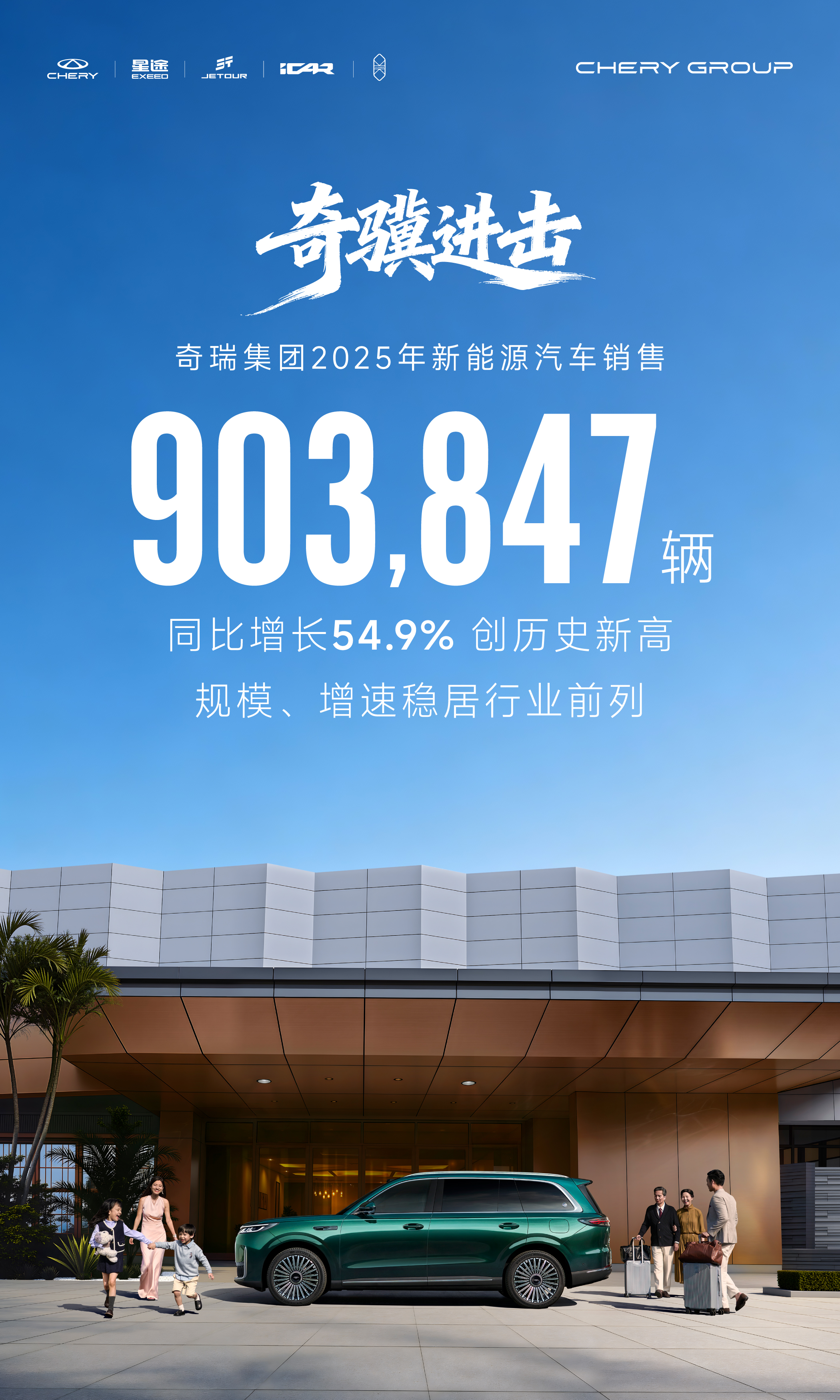 站在新能源年销量超90万辆的新起点,奇瑞集团将依托更加完善的产品布局、行业领先的技术创新体系和可靠的产品品质,为全球用户带来高质量的绿色智能出行解决方案。