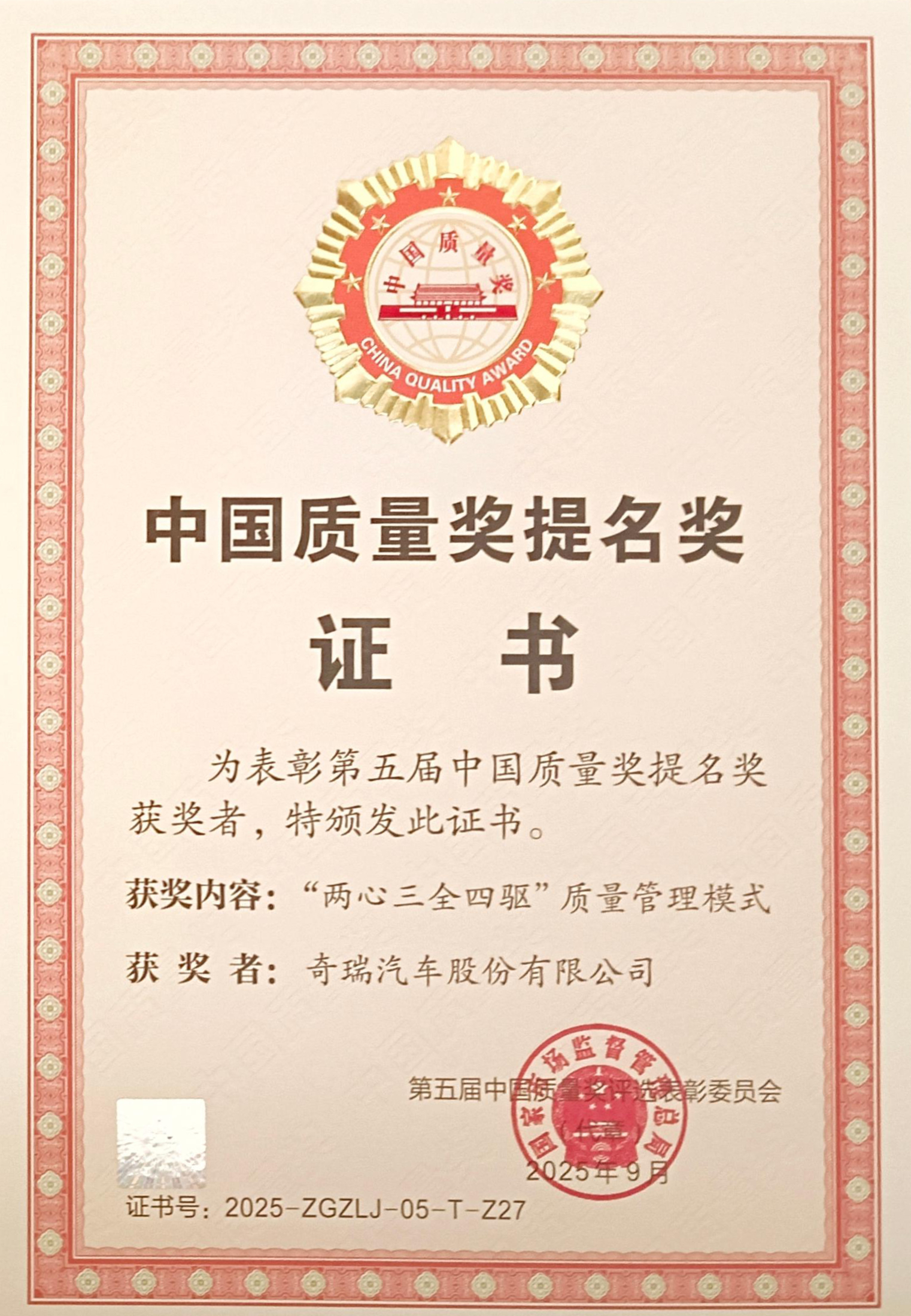 奇瑞把质量视为企业良心和长期追求。9月8日,星纪元ES获得欧洲ENCAP五星安全认证,至此集团累计51款车型获全球各类五星安全认证,是获得全球五星安全最多的中国品牌。凭借独创的“两心三全四驱”质量管理模式,奇瑞汽车还在9月份获得中国质量领域最高荣誉认可——中国质量奖提名奖。